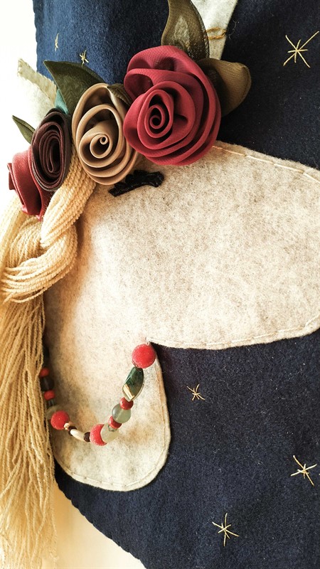 הדגל וראש חד הקרן עשויים מלבד, רקמה, והשיער עשוי פוליאסטר וניילון.