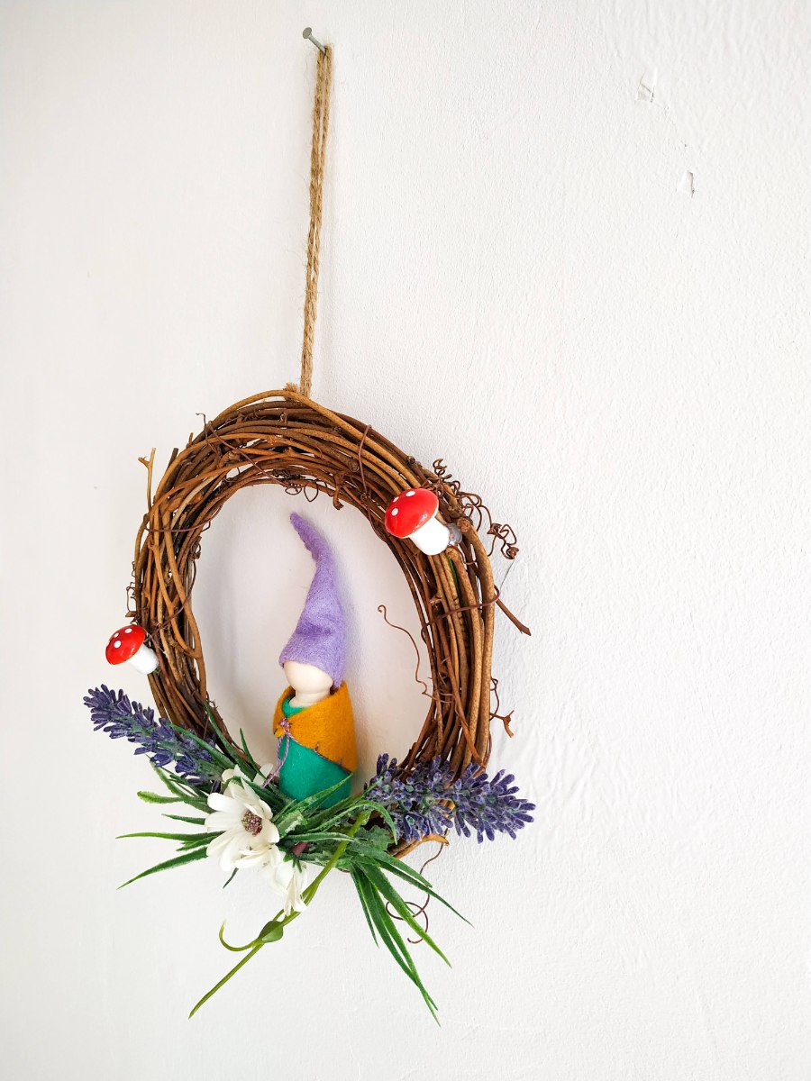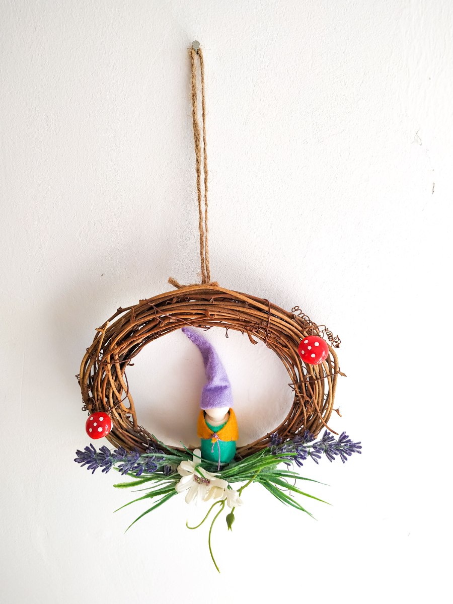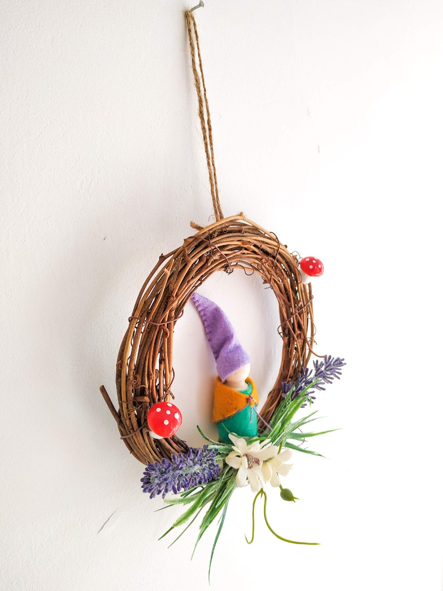 עשוי מ- לבד, חוטי רקמה, עץ, דבק נגרים, דבק חם, משי מלאכותי, פלסטיק, זר ענפי גפן.