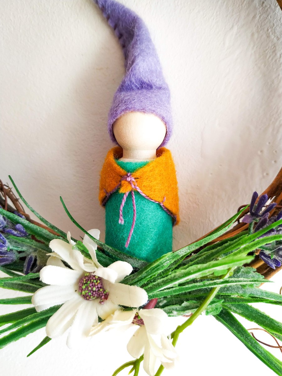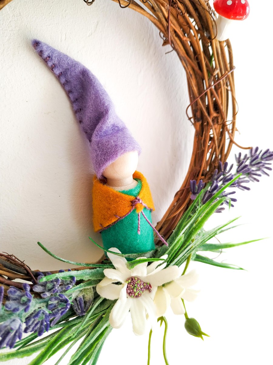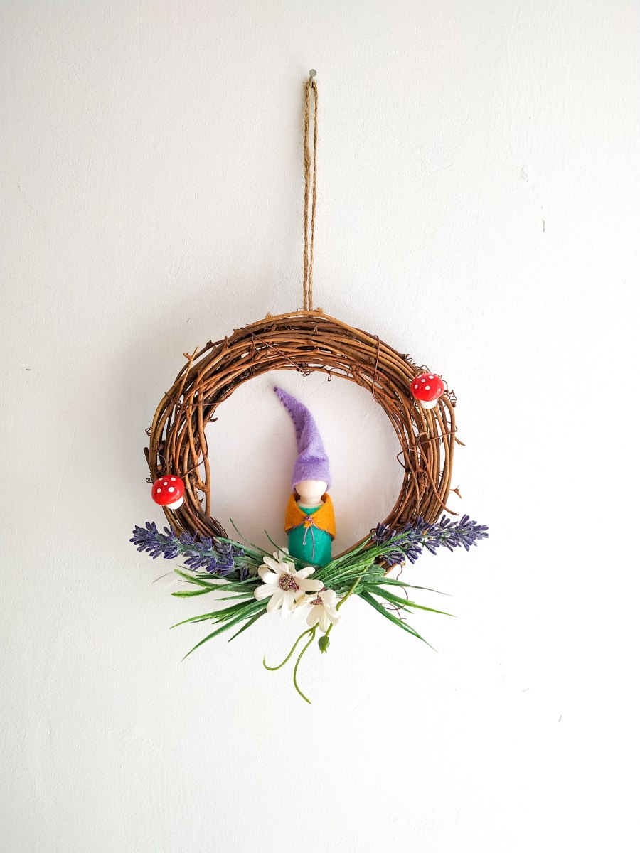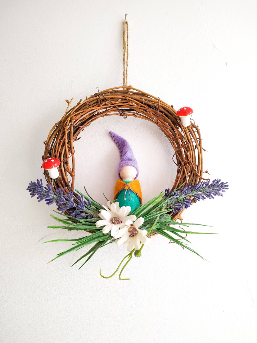 עשוי מ- לבד, חוטי רקמה, עץ, דבק נגרים, דבק חם, משי מלאכותי, פלסטיק, זר ענפי גפן.